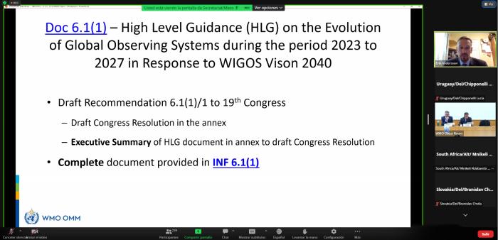 Están participando en representación del Uruguay el Gerente Técnico Tte. Cnel. (Av) Retirado Yamandú Morán, Director de Área Monitoreo Atmosférico y Sensores Remotos (AMASR) Tec. Met. Daniel Bonora y Asesora Científica Dra. Lucía Chipponelli, participan remotamente de dicha sesión.