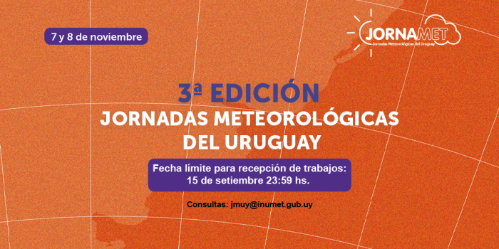 El Instituto Uruguayo de Meteorología se complace en anunciar la 3° Jornada Meteorológica del Uruguay (JORNAMET), que se llevará a cabo los días 7 y 8 de noviembre del presente año.