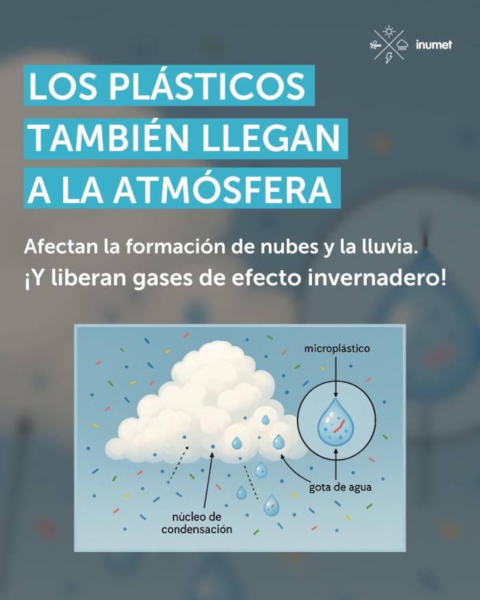 El plástico no solo amenaza la biodiversidad terrestre y marina: también tiene implicancias climáticas. Una investigación reciente de la Organización Meteorológica Mundial ha detectado microplásticos en la atmósfera, actuando como núcleos de condensación impactando en los patrones meteorológicos, principalmente en la formación de nubes. Además, la degradación de plásticos por radiación solar emite gases de efecto invernadero, como el metano, contribuyendo silenciosamente al cambio climático.