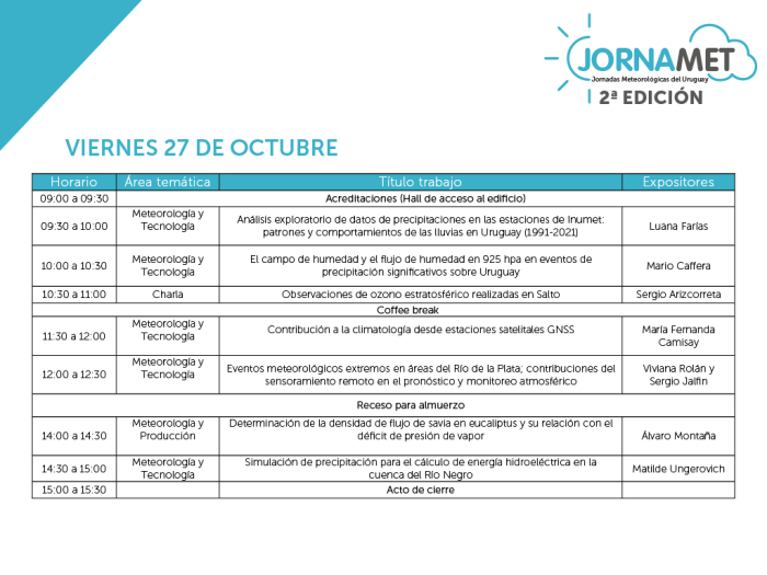 El Instituto Uruguayo de Meteorología se complace en anunciar la 2° Jornada Meteorológica del Uruguay (JORNAMET), que se llevará a cabo los días 26 y 27 de octubre del presente año.