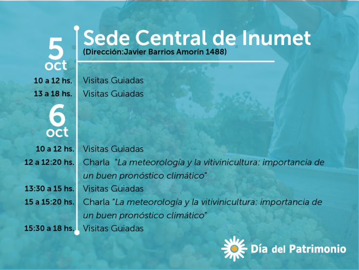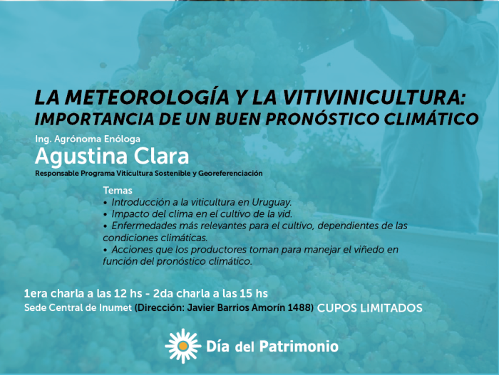 Como actividad destacada, el domingo en la sede central se ofrecerá una charla sobre la importancia de la meteorología para la vitivinicultura, en línea con el tema del Día del Patrimonio de este año: "El vino como tradición: inmigración, trabajo, innovación". La charla estará a cargo de la ingeniera agrónoma y enóloga Agustina Clara, quien hablará sobre la viticultura en Uruguay, el impacto de la meteorología en los viñedos y las estrategias utilizadas por los productores para gestionar los viñedos en función del pronóstico climático. La actividad es en conjunto con el Instituto Nacional de Vitivinicultura (INAVI) y se desarrollará una instancia a las 12:00 y otra a las 15:00 horas, con una duración de 20 minutos cada una.
